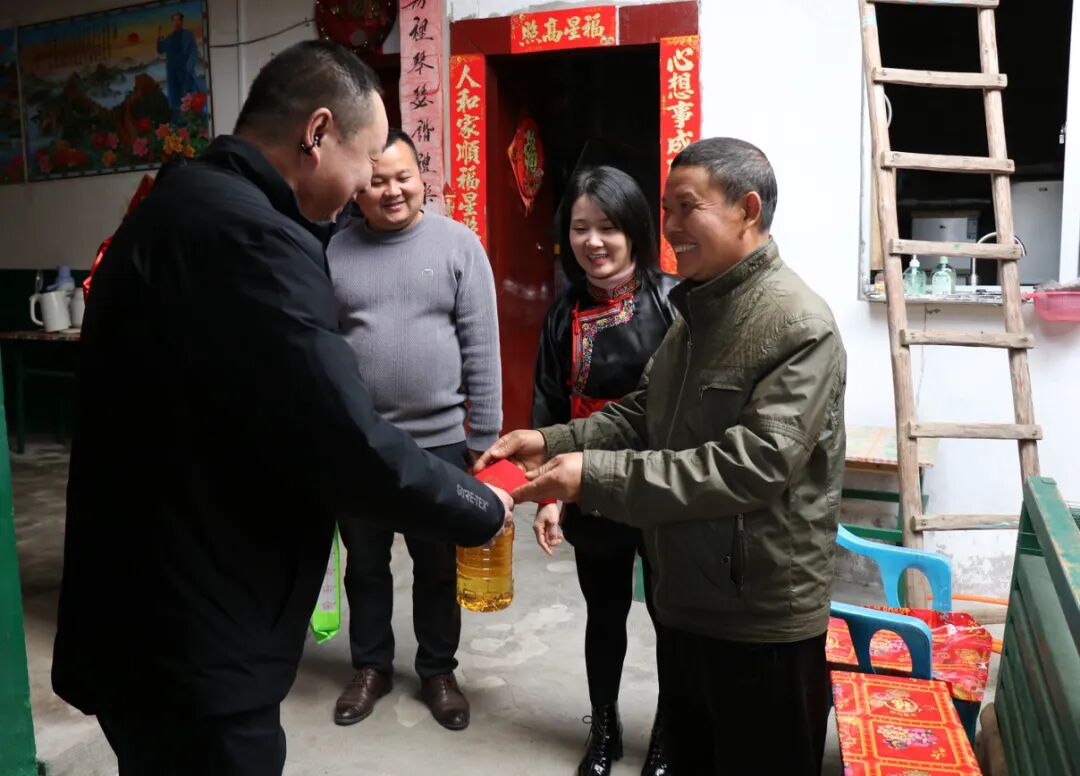 2月5日上午,集團黨委委員、總會計師王貴長帶隊深入福安市康厝畬族鄉金斗洋村,看望慰問石化設計院省派駐村第一書記林澤坤和當地困難群眾,向他們送上組織的關懷和溫暖。圖為王貴長(左一)慰問當地困難群眾。(張文英 攝)